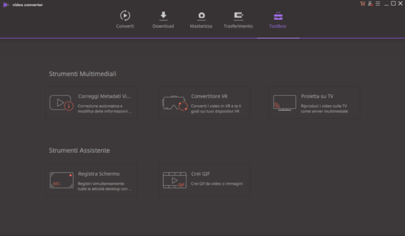Dalla schermata principale di video converter clicca in alto su TOOLBOX e si aprirà questa finestra: